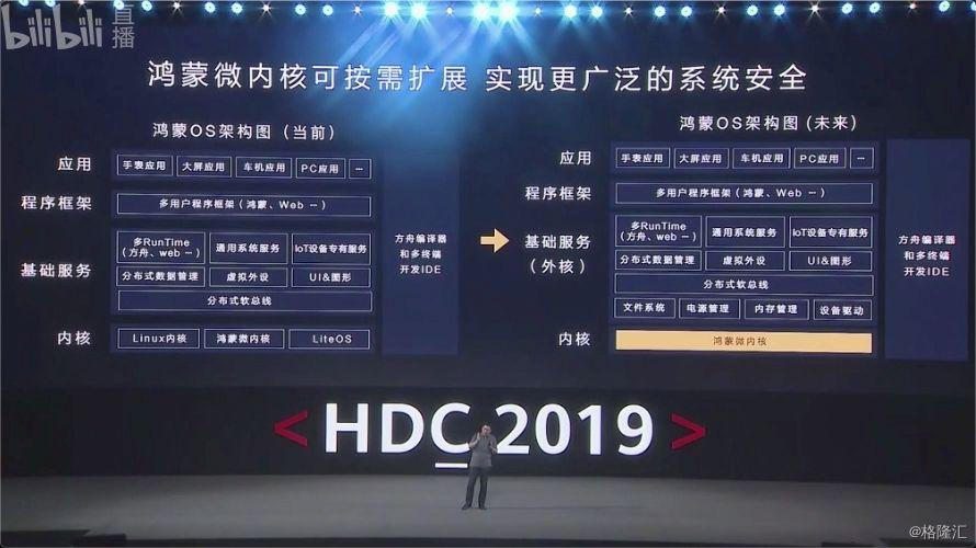 最后,余承东亮出了鸿蒙OS的架构图,而且是“当前”和“未来”的架构图。