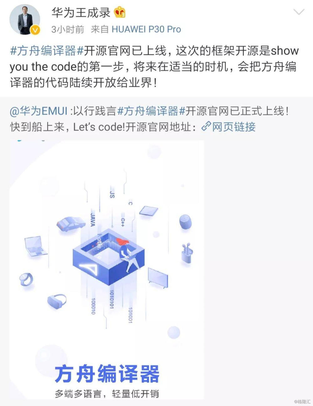华为消费者 BG 软件部总裁王成录表示方舟编译器代码会陆续开源