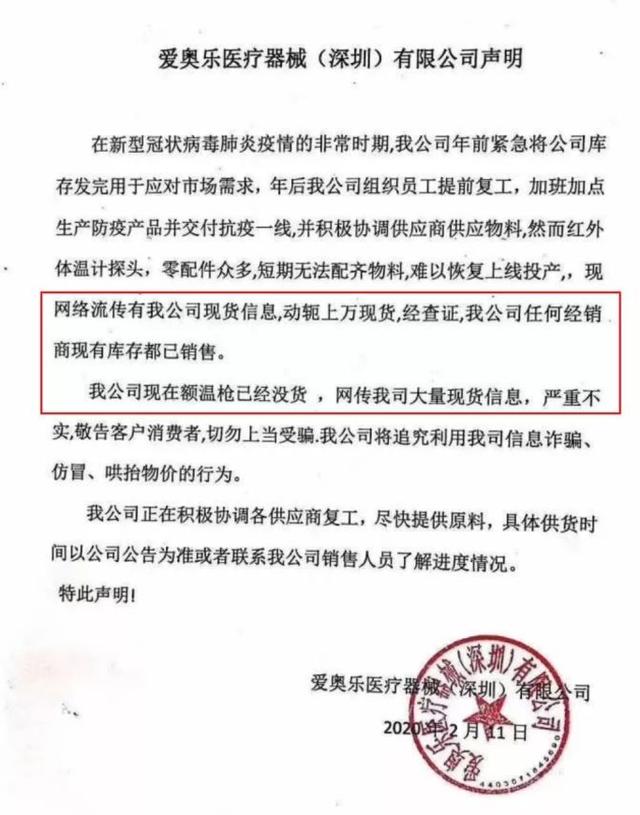 日前,深圳爱奥乐和广州倍尔康医药器械公司先后发布声明称,红外体温计零配件众多,短期无法配齐物料,难以大批量上线投产,产能极其有限。目前正在积极协调各供应商复工。