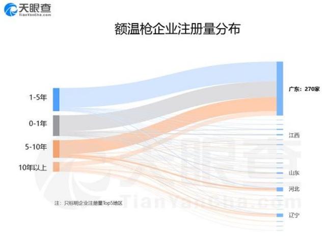 天眼查专业版数据显示,我国目前共有357家企业从事额温枪的相关业务。在数量上,广东省以270家的绝对优势遥遥领先,占全国相关企业总数的75.6%。2020年以来,我国共新增63家经营额温枪业务的相关企业,且全部于2月之后新增成立,占比近18%,依旧主要集中在广东省。
