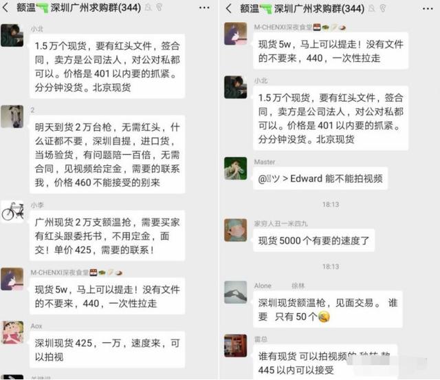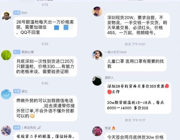 另有企业主在网上透露称,为了企业复工,自己曾卧底多个“额温枪倒爷群”中,如果发出寻找额温枪消息,很快就会出现了好几个好友申请。