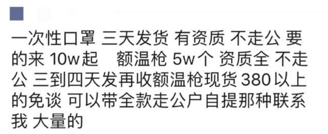 在上述企业主网友发出的截图中可以看到,额温枪的广告信息中,这些散播的消息都用统一的模板:“地区+数量+价格+发货时间”,如果更谨慎的,则会友人加上定金和具体交易时间。