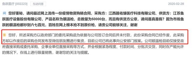 随后,鱼跃医疗不得不在互动平台上进行官方辟谣,称该采购合同已经作废,是采购方借机进行集资,目前公司已经向公安部门进行报案。
