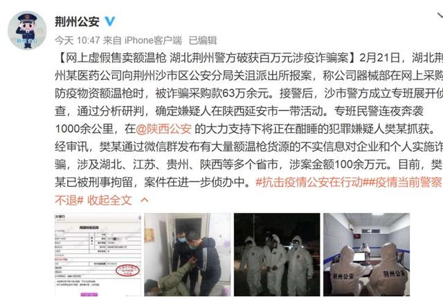 3月3日,湖北荆州警方通报一起网上虚假售卖额温枪诈骗百万的涉疫案件。2月21日,荆州一家医药公司报案称,网上采购额温枪被骗63万余元。经审讯,嫌犯樊某通过微信群发布有大量额温枪货源的不实信息,对多省市企业和个人实施诈骗,涉案金额100余万元。