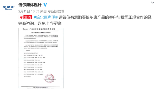 2月11日,广州市倍尔康医疗器械公司在官微发布一则打假消息,强调“倍尔康产品不会在微信群或者朋友圈等社交平台销售,切勿上当。”广州南沙官方微信也发文辟谣。据了解,倍尔康是国内知名的智能体温计生产商之一。