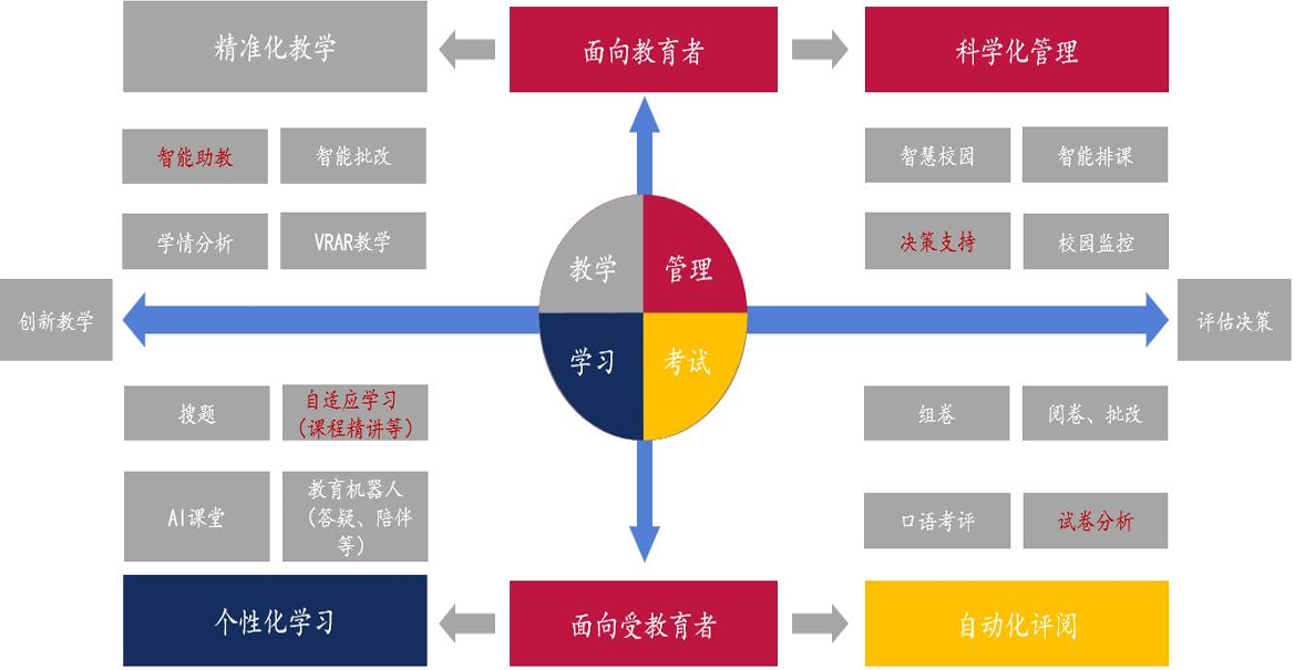 AI与教育场景结合深入,实现多维度应用。伴随AI技术持续迭代,其与教育场景结合逐渐深入,既可以面向教学提供方给予精准教学辅助,助力提升教研、备课等环节效率,在减轻负担的同时实现科学化管理,又可以面向教学接受方提供个性化教学,切实满足个体学习需求,进行因材施教,并通过自动化评阅,解放测评等环节运转提升效能。