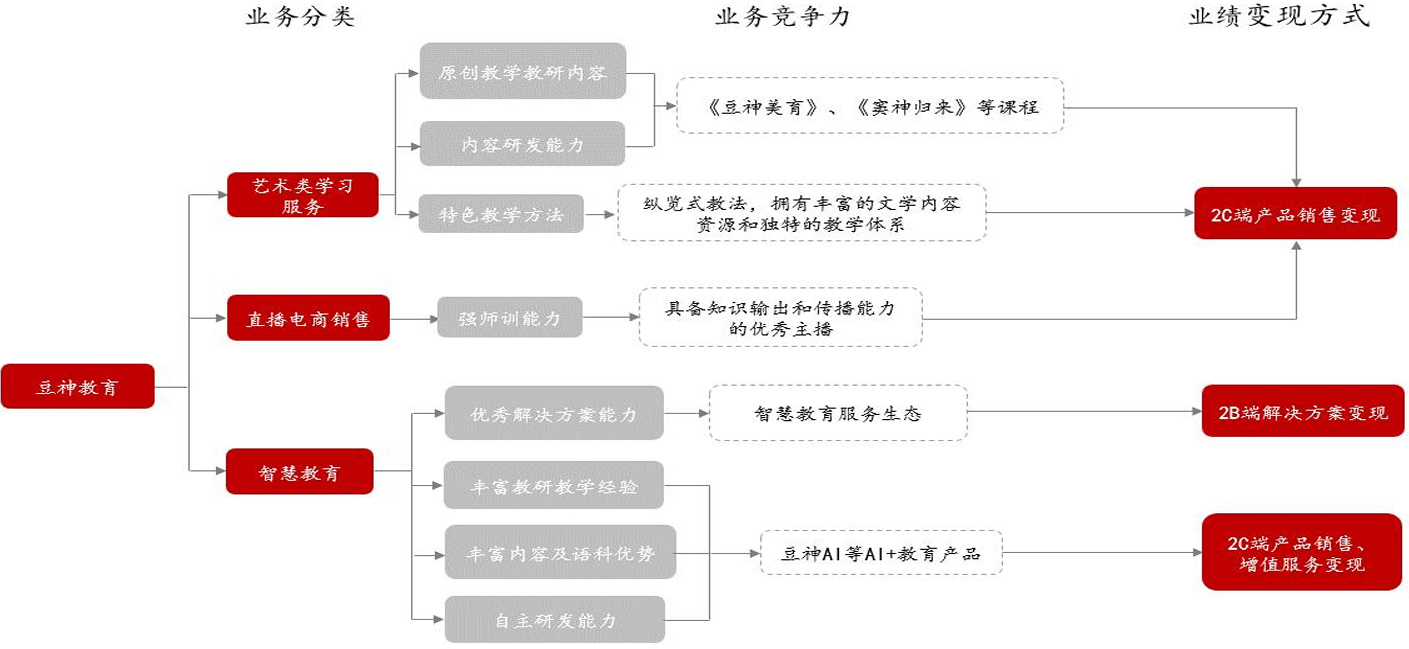 公司商业模式:聚焦艺术类学习服务搭配直播电商转化,拓展AI+教育生态。首先,公司转型后发力艺术类学习服务业务,积累了大量原创教学教研内容, 并不断创新《豆神美育》等系列课程,保持核心内容创新优势。同时,公司搭配了独特的教学体系,旨在提升学习者兴趣与文学素养,通过产品销售变现。其次,公司对于既有名师进行转型塑造,基于现有深厚文学积累和出彩演讲能力,将名师打造成具备较强卖货能力的知识主播,在抖音等直播平台上进行品牌推广以及产品销售。再次,公司在智慧教育领域,一方面形成了立体化顶层设计理念与方法论,为各类高校、中小学提供智慧教学资源等解决方案,打造智慧教育服务生态。另一方面,公司凭借在阅读、大语文等领域的深厚教学教研经验与语料资源 积累,致力于将AI技术融入教育各场景,并推出豆神AI等产品,构建了以“软件+硬件+服务”为闭环的AI教育生态,通过产品销售、增值服务变现。
