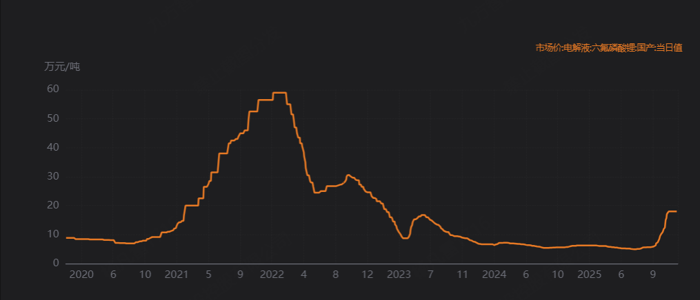 六氟磷酸锂价格今年8月底以来,价格从5万元/吨,持续上涨到目前18万元/吨。上涨超260%。6F景气度的反转,主要还是源于供需紧张。在供给端,2025年上半年因碳酸锂价格持续走低,下游企业为防范 库存跌价风险大幅降低原料库存(较Q1末下降72%),导致六氟磷酸锂厂家开工率走低;而进入九月后,在国内外储能政策优化与需求爆发的 双重推动下,2025年第三季度中国储能电芯出货量达165GWh,同比增速达65%,需求迅速拉升,但头部企业虽满产满销,新增产能却有限, 库存见底与供给弹性不足共同导致结构性供应紧张,从而推动价格持续上行。