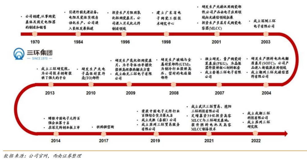 三环集团成立于 1970年,其前身为潮州无线电瓷件厂,2014年公司于深交所成功上市。 公司集材料、产品、装备研发与制造为一体,是全国最大的先进技术陶瓷、电子元件生产基 地之一。公司深耕陶瓷电子元件领域数十年,专注于各种电子陶瓷的研发和生产,经过几十 年电子陶瓷领域的技术积累,成为国内陶瓷领域元器件研发与生产的龙头企业。公司独立完 成从原材料到成品的生产全过程,在生产加工和工艺控制上形成了具有特色的工艺技术路线。