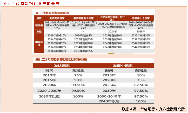 因为一二代制冷剂对地球臭氧层具有破坏左右,所以国际上现在,一代制冷剂已经不给生产销售,二代制冷剂也在逐步消减配额,到2030年也将完全禁止生产销售。当下时间点,制冷剂行业的优秀公司正处在行业变革期,可以重点提高关注。