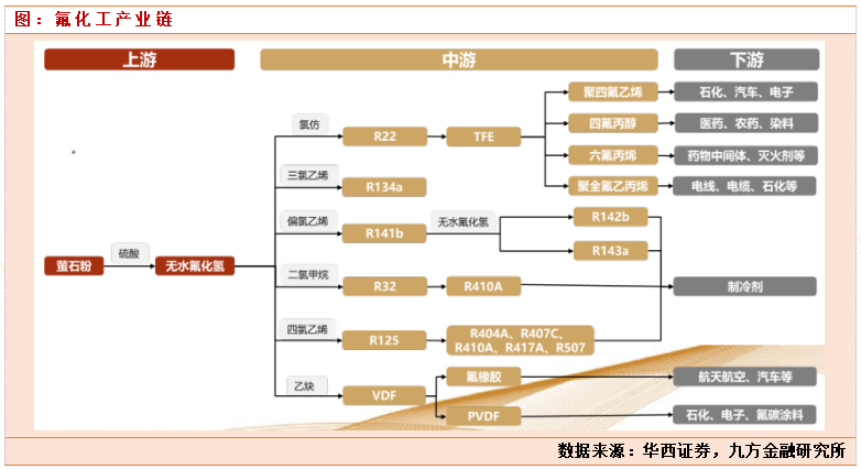 上游是萤矿石,和硫酸反应得到氢氟酸,氢氟酸通过一系列化学反应得到制冷剂R22,R32等。制冷剂下游主要用作生活的各个方面,有汽车,医药,家电,塑料,航天等等各个方面,但是最大的下游是用在制冷方面。