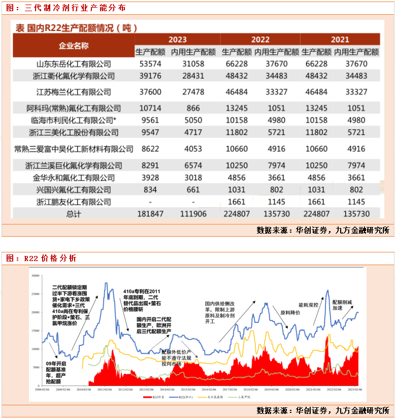 以二代制冷剂主力R22分析,拉长价格复盘来看,R22的价格中枢都在慢慢提升,从1万到目前2万。主要原因是二代制冷剂的配额在不断的减小的原因。目前处在三代制冷剂配额分配前夜,复盘二代制冷剂价格,我们可以得出三代制冷剂价格也是一样,价格中枢长期会不断抬升,中短期会受到行业供需错配的影响价格波动。