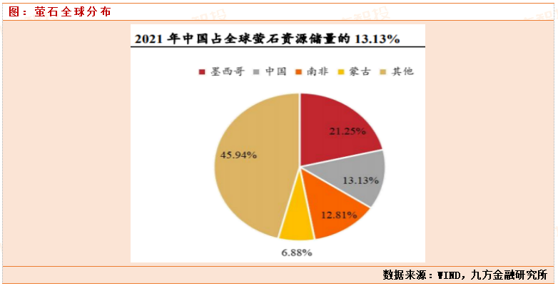 世界萤石总储量为3.2亿吨(折合CaF2),其中墨西哥、中国、南非、蒙古萤石储量位列前四,分别为6800万吨、4200万吨、4100万吨、2200万吨,占全球萤石储量比分别为21.25%、13.13%、12.81%、6.88%。我国萤石产量540万吨,占据全球总产量的 62.79%,为全球萤石最大生产国。未来随着国内萤石矿石资源的缩减,上游萤石的价格会不断抬升,氟化工也会有一定的成本支撑。