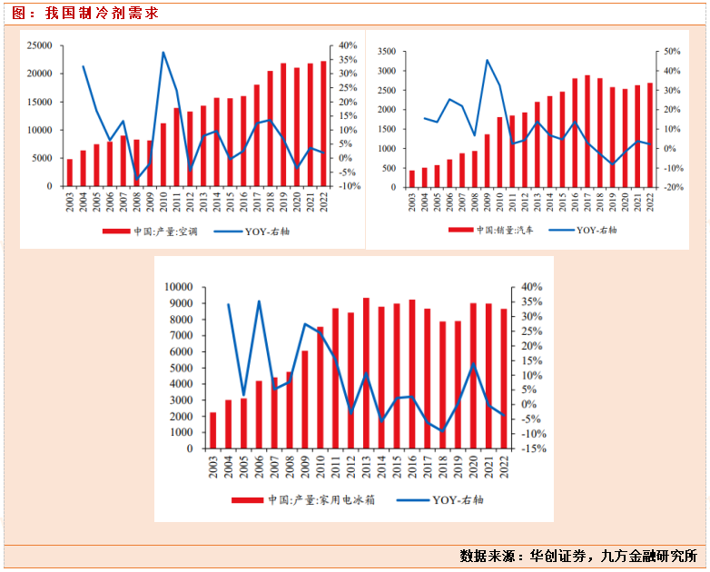 制冷剂下游需求主要用于空调,汽车,冰箱中,其中空调占比约78%、冰箱占比约16%、汽车占比约6%。2022年国内空调产量达到2.22亿台,同比+2%,冰箱产量达到8664万台,同比-4%,汽车产量达到2686万辆,同比+2%。