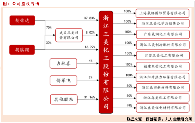 公司简介:三美股份核心业务是氟制冷剂,氟发泡剂和氟化氢氟化工业务。公司2001年成立,20多年,一直致力于发展氟化工行业,目前公司氟化工可以实现产业链一体化生产。公司是家族企业,实际控制人是胡荣达父子,两人直接或间接持股比例总计为 62%。
