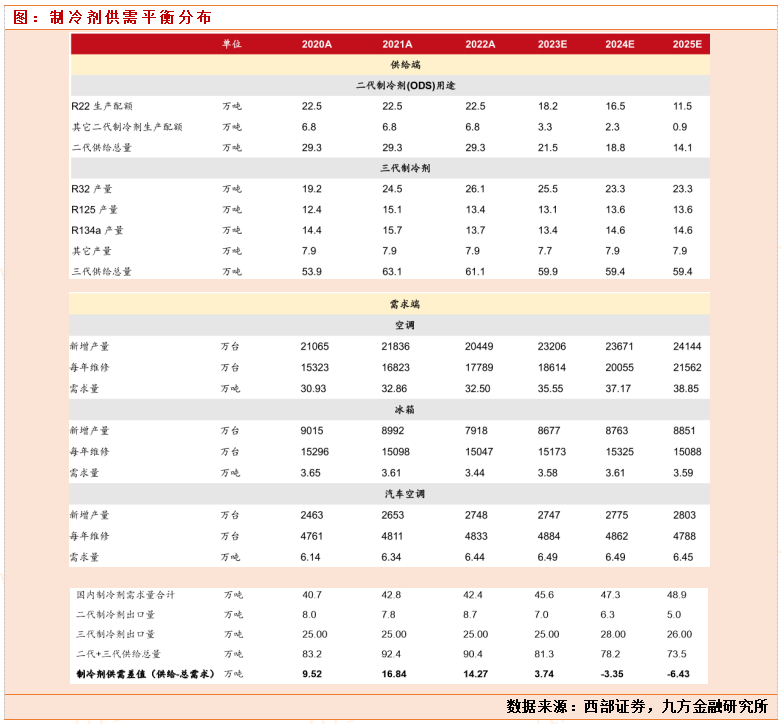 我国制冷剂下游需求是比较稳定的,制冷剂最大下游是空调,我国每年空调产量在2.22亿台,从2018年高点以来,基本保持在2亿台以上,每年新增空调+维修空调需要用的制冷剂在35万吨左右。