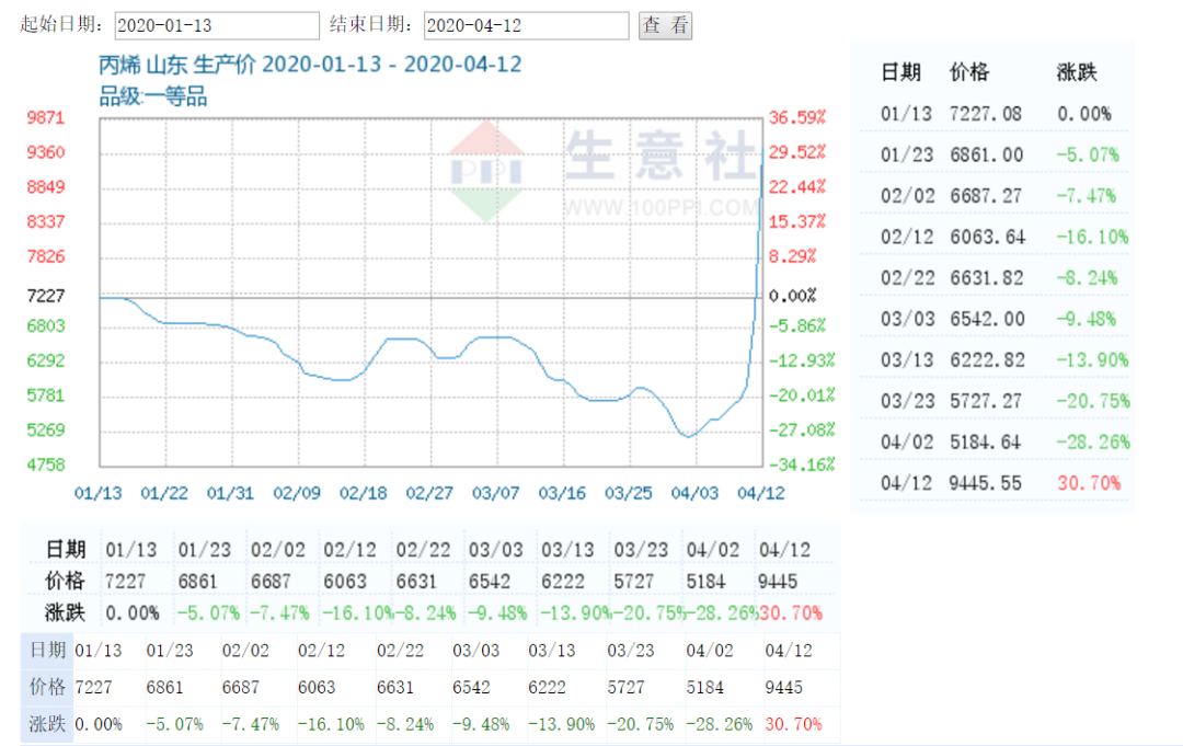 的确,周末两天时间,丙烯价格巨幅上行,成为国内化工行业人士的关注热点。有券商化工分析师发朋友圈表示,“庚子年注定是不凡的一年,而4月上半月更是如此。尽管11日-12日是周末,但烯烃人估计都是疯狂度过的,相比OPEC+会议,丙烯、聚丙烯更加的疯狂。”
