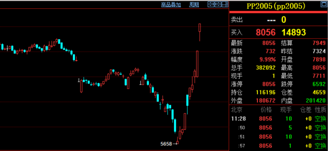 4月13日早间,国内期货市场上聚丙烯主力合约2009再度强势上行,截至上午收盘报7224元/吨,涨幅5.92%。而此前在4月10日,聚丙烯主力09合约开盘6650点,最高7007点,收盘6983点,日涨240点,涨幅3.56%;而05合约则大涨732点,当日涨停,涨幅高达10%。