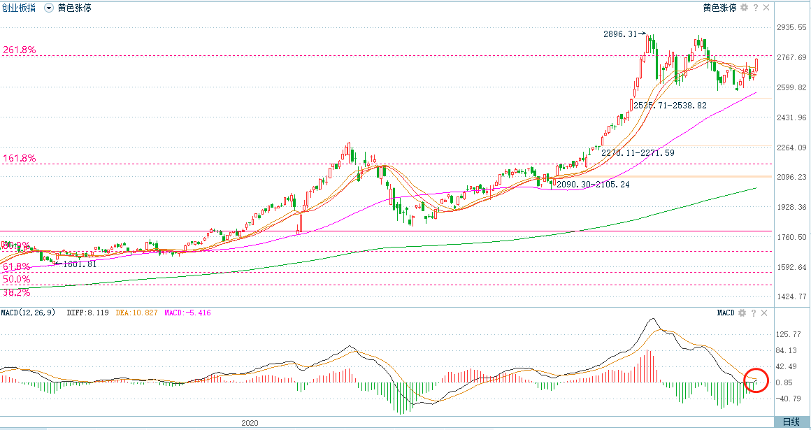 其次,创业板来看,今天同样收出大阳线,成交量继续保持,这样是冲前高的姿态,MACD绿柱子继续缩短,DIFF、DEA均线马上要金叉,目前上涨笔已经形成,接下来要延续,但具体能走多远,还需要量能配合,当然,策略哥也会持续跟踪的。