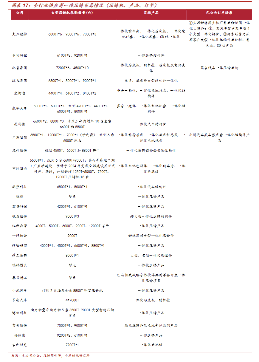 一体化压铸:市占率约5%(行业第三),仅次于文灿股份、广东鸿图,已布局5000T-9000T设备,服务理想、小鹏等。