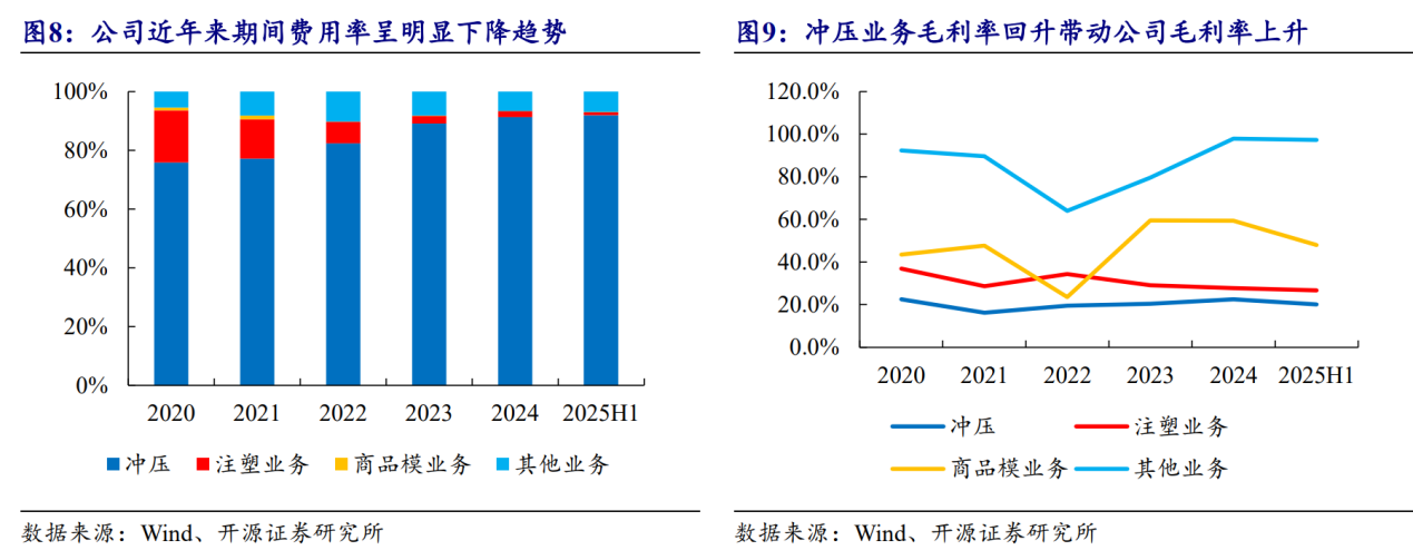 冲压业务为公司主要业务,新业务开拓带动毛利率回升。2025年上半年,公司冲压、注塑、商品模、其他业务营收占比分别为91.99%、1.08%、0.01%、6.92%。随公司车身件产品放量,公司冲压业务毛利率近年来稳步回升。同时公司积极布局压铸业务,部分减震塔项目已量产,部分后地板项目已小批量生产,侧围后部内板等部分项目2025年年内会逐步量产。