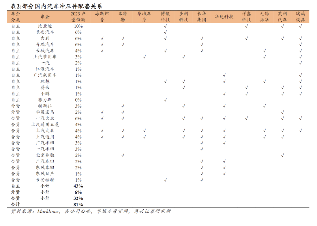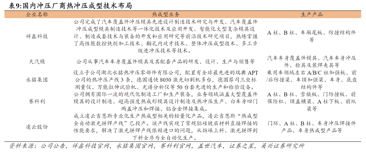 民营厂商 | 成本优势显著 聚焦量产件 | 全工艺链+模块化方案,模具自研降本 | |