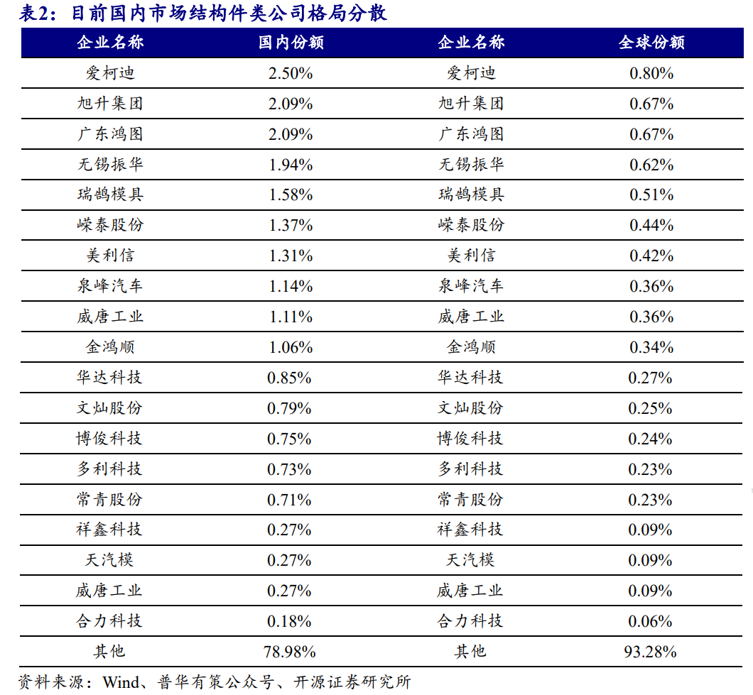 冲压件市场空间大,公司市占率仍然较低。冲压件是汽车重要组成部分,国内3000亿左右市场规模,全球约1.5万亿市场规模,目前市场格局分散。结构件与下游车企深度绑定,随着自主品牌崛起带动结构件市场持续增长;同时近年一体化压铸由于降本增效显著逐步为市场接受迅速放量,有望2025年突破百亿市场规模,成为新增长点。