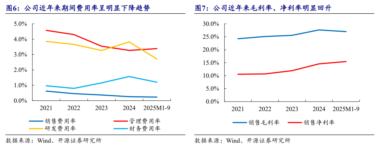 盈利能力:盈利能力持续提升。2025年前三季度毛利率为26.99%,净利率为15.38%,均高于去年同期水平。其中Q3单季度毛利率和净利率环比均有显著改善,规模效应和降本增效成果显现。