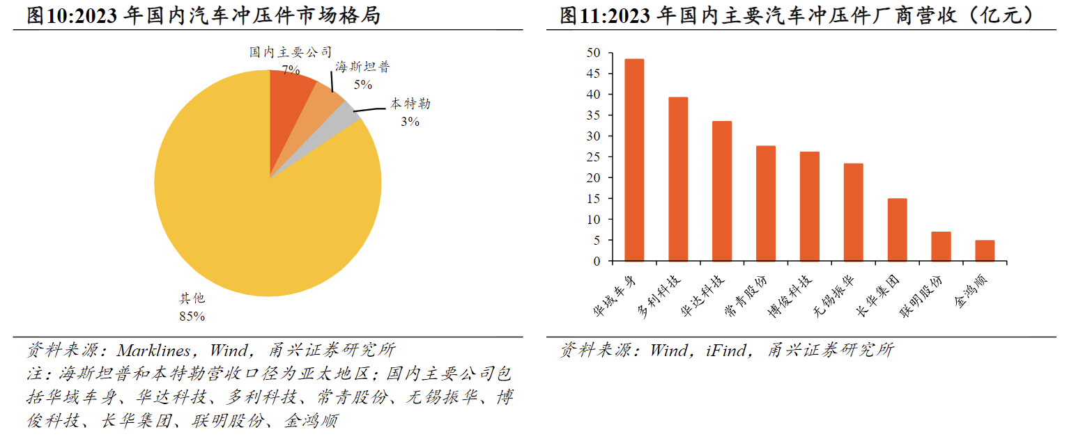 冲压件:国内市占率约3.8%(行业第五),热成型件市占率约12%,高端车型核心部件(如问界M9)市占率超30%。