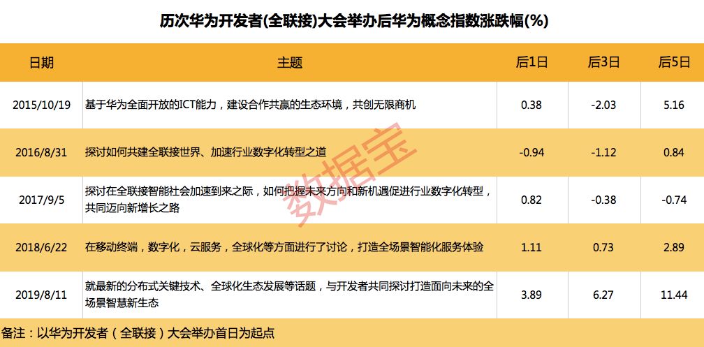 证券时报·数据宝统计显示,在过去5年里,华为开发者大会举办后(以举办首日为基点)1日,举办后5日,华为概念指数上涨概率达到80%。以2019年为例,华为开发者大会于2019年8月11日举办,华为概念指数及华为鲲鹏概念指数在举办后1日分别上涨3.89%、0.9%,举办后5日分别上涨11.44%、9.97%,而大盘在开发者大会举办后1日、5日分别上涨0.81%及3.9%,跑输前两个指数。