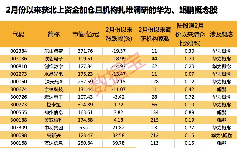 科技股行情依然在持续,华为概念板块备受青睐。数据宝统计显示,2月份以来获北上资金增仓,且机构扎堆调研(2月份以来调研机构超5家)的华为、鲲鹏概念股仅有13只。与板块其它个股相比,这13股市值普遍较低,仅华为概念股东山精密、拉卡拉市值超过300亿。