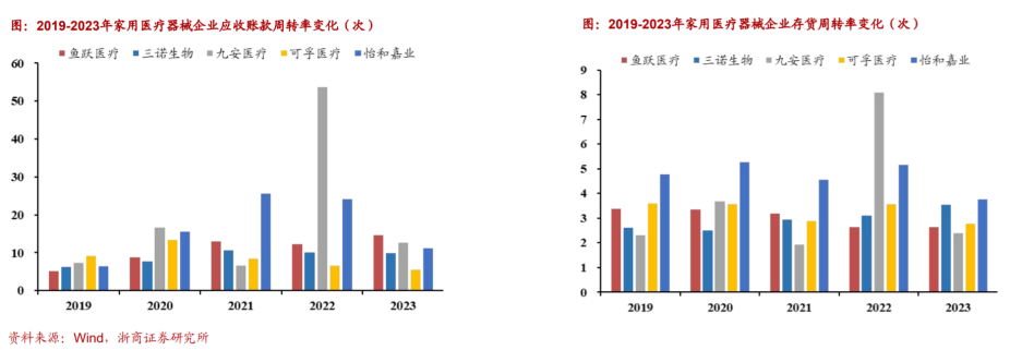应收账款周转率提升,轻装上阵、放量可期。2019-2023年,非常态化需求增长,家用医疗器械企业平均应收账款周转率大幅提升,由2019年的6.9提升至2023年的10.7,渠道库存出清,营运能力提升,多元化产品快速放量可期