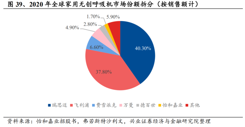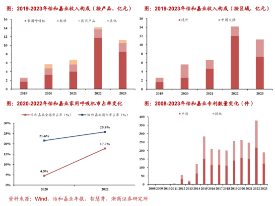 怡和嘉业:作为国产呼吸机龙头,公司在海外采取买断式经销为主、直销为辅的销售模式,主要通过传统渠道以报关出口方式向海外经销商分销产品,再由海外经销商销售给终端客户,经销占比连续多年维持在99%。作为国内最早拓展海外家用无创呼吸机的企业之一,公司先发优势明显,2010年8月起公司开始与美国经销商ReactHealth(原3B公司)开展合作,该公司拥有美国和加拿大销售公司用于治疗睡眠呼吸障碍的睡眠治疗设备的专营权,并负责公司相关设备的510(k)申请,双方共同经营海外品牌“Luna”。ReactHealth作为美国本土品牌,并不生产家用呼吸机设备,因此公司可以利用其在美国的渠道和品牌影响力,在美国呼吸机市场已经较为成熟的当下快速进入美国市场。恰逢2021年飞利浦呼吸机FDA召回事件,合作方ReactHealth及时捕捉了海外渠道的变化并将生产需求反馈至怡和嘉业,怡和嘉业则通过高效的国内产业链抓住了机会、迅速扩大其市场份额。2022年怡和在全球家用呼吸机市场的份额(销量口径)已经提升至17.7%,份额跃升至全球第二。