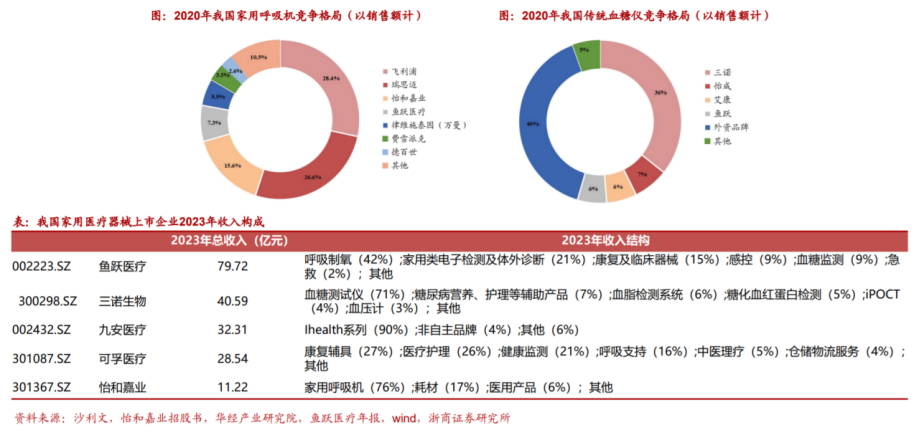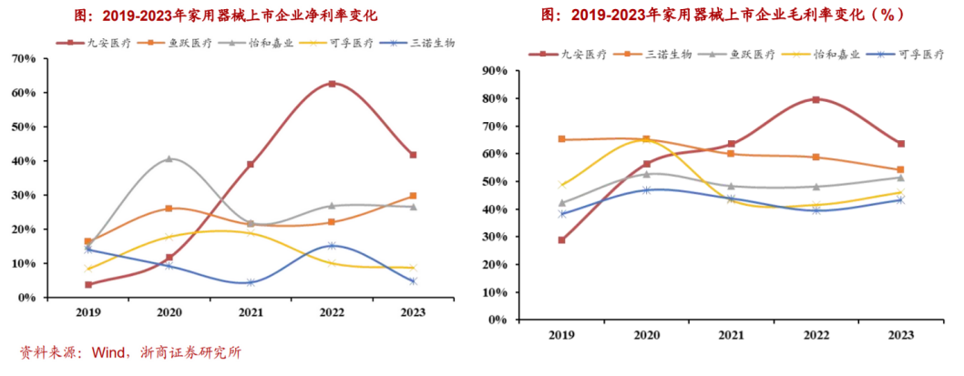 家用器械认知误区:供给侧分散=护城河低。家用医疗器械产品多样,厂商较多,上市企业依托渠道优势,产品多样化布局。但我们认为,供给侧分散≠护城河低,家用器械产品认证、稳定性、高端化等,均存在技术壁垒,且家用器械品牌力构建主要护城河,带来高盈利能力。