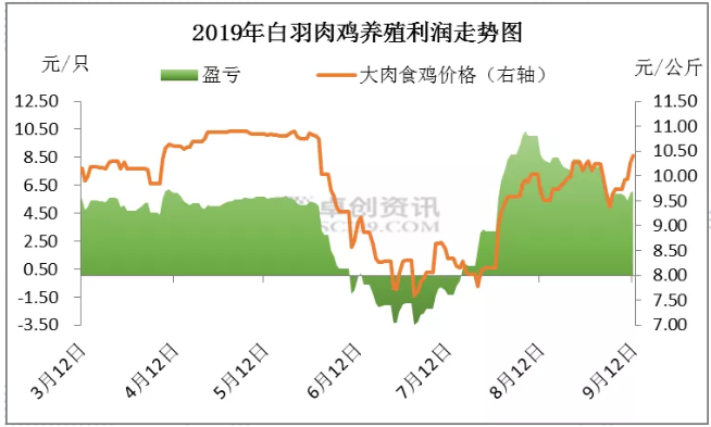 需求:肉鸡养殖扭亏为盈,对鸡苗需求增加。6月10日至7月16日大肉食毛鸡养殖处于亏损状态,养殖户亏损较多,补栏积极性不足,鸡苗才开始大幅走低。而7月17日开始,毛鸡养殖开始扭亏为盈,养殖户盈利逐渐增加,至8月7日左右肉鸡养殖盈利已高达10.34元/只,肉鸡养殖盈利异常丰厚,养殖户盈利增多,补栏鸡苗积极性明显提高,支撑鸡苗价格在8.00元/羽的水平短时震荡盘整后继续走高,并一举突破10元大关。