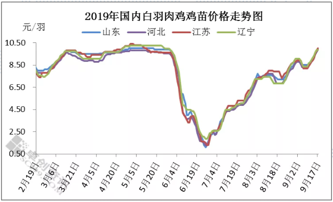 9月16日大肉食鸡苗价格突破10元大关,在高价毛鸡的支撑下,鸡苗价格继续冲高。截止9月19日山东地区大型孵化场鸡苗报价已涨至10.50元/羽,再创历史新高。