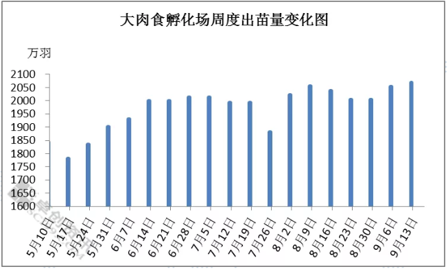 供应:鸡苗价格跌至低位后,孵化场排苗不畅,部分企业有对大周龄换羽种鸡和抽毛蛋的操作,造成鸡苗供应小幅缩减。7月份,卓创资讯统计的孵化场周平均出苗量1970.93万羽,环比跌幅0.75%,7月月内周度出苗量呈现逐步下降走势。6月份鸡苗价格呈现跳水走势,孵化企业亏损严重,部分孵化企业有淘汰及换羽大周龄种鸡情况,加之外购种蛋企业上蛋积极性较差,7月份整体出苗量有所下降。7月鸡苗价格较低,养殖户补栏积极性提高,鸡苗价格得以上行。进入8月中旬,毛鸡市场出现短暂下滑,拖累鸡苗市场,养殖户补栏热情稍有降低,鸡苗价格小幅盘整。随着后期养殖盈利的不断增加,肉鸡养殖热点再次点燃,截止9月18日,鸡苗价格已经与2019年最高价格持平。