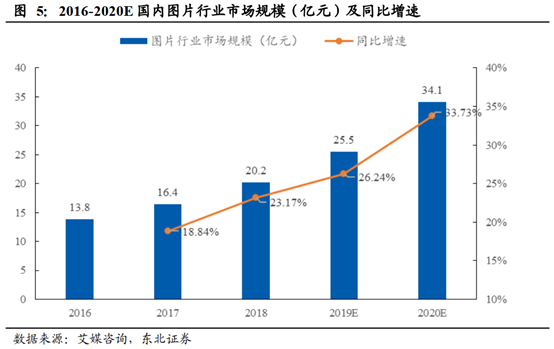 2019年国内图片行业市场规模为25.5亿元,正版化率约10.89%。G端客户主要为党政机关和主流媒体,用户数量庞大。随着国家级影像版权服务平台的建立及相关法律的完善,正版化率的提高成为了版权市场空间提升的长期驱动力。国内图片市场规模有望进一步增长。根据预测,2020年图片行业市场规模有望达到34.1亿元。