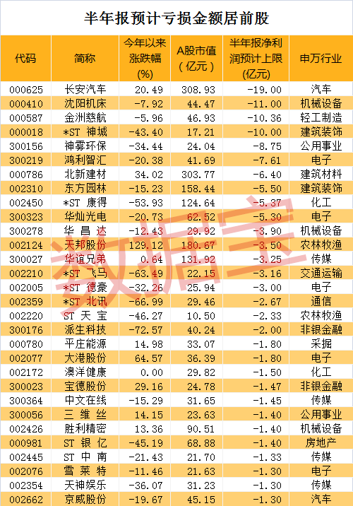 金洲慈航、*ST神城、神雾环保、鸿利智汇、北新建材等预计亏损金额均超5亿元。上半年预计盈利但净利润增速创五年新低的有利亚德、万达电影、东华能源、韶钢松山、长城汽车等。