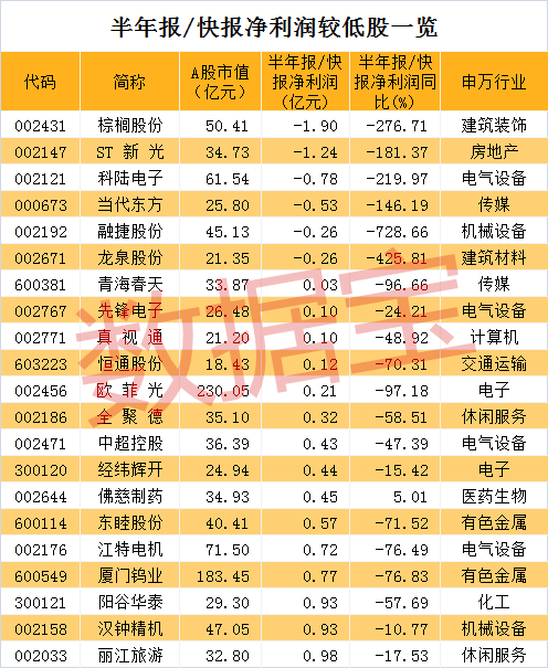 已经披露半年报及业绩快报的个股中,棕榈股份、ST新光、科陆电子、当代东方、融捷股份、龙泉股份6股上半年净利润亏损,其中棕榈股份、ST新光净利润亏损均超亿元。32股上半年虽有盈利,但净利润增速却降至五年新低,如海大集团、分众传媒、苏泊尔、陆家嘴、海康威视等。