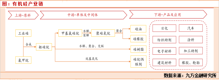 有机硅材料是重要的工业基础原材料,被称为“工业味精”。有机硅材料品种繁多,但其生产原料,及有机硅单体品种为数不多,其中二甲基二氯硅烷占总单体量的90%以上,其他单体还有苯基氯硅烷和乙烯基氯硅烷等。有机硅材料由Si-O键为主链构成,其性能兼具无机物和有机物的优势,如耐高低温、抗氧化、耐辐射、介电性能好、难燃、脱膜、温粘系数小、无毒无味及等性能,应用广泛。有机硅产业链的上游是有机硅单体,产业链的下游是以有机硅单体为原料生产的硅油、硅橡胶、硅树脂、硅烷偶联剂等四大类深加工产品,其中硅橡胶占比超过60%。有机硅因其优秀的特性,被广泛应用于航天、航空、汽车、战车、舰船、建筑、电子、电气、纺织、造纸、医疗卫生、食品、日用化学品等等领域。