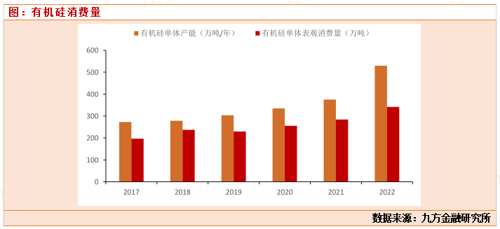 有机硅单体和有机硅中间体的产能折算比例约为2:1。国内有机硅需求量2017-2022年,我国有机硅单体的消费量从197.1万吨增长至341.4万吨,CAGR为11.61%。而行业有机硅总产能超600万吨,而需求才340-350万吨左右,产能过剩超250-260万吨,属于严重过剩。
