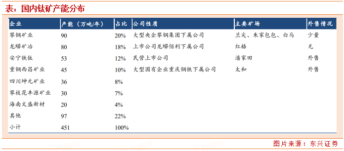 从目前来看,由于国内钛资源储量90%位于四川,而四川最优质矿区(钛磁铁矿岩矿:主要矿床分布在四川省的攀枝花和红格,米易的白马,西昌的太和)基本已被行业前四家龙头(攀钢集团、龙蟒矿冶、安宁股份、西昌太和)瓜分。国内钛精矿较为明显的行政许可壁垒和资源稀缺性壁垒,目前还没有企业有明显的资本开支和扩产计划;上市公司安宁股份IPO募投项目仅为通过技改扩建的方式提升现有总产能约15%。