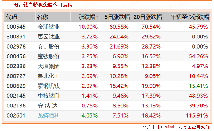 近期受益于经济数据向好和复苏预期,在涨价逻辑引导下,二级市场上钛白粉概念股表现十分抢眼。其中,金浦钛业、惠云钛业、安宁股份近5个交易日累计涨幅超20%。