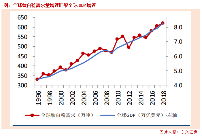 钛白粉每年自然需求增长约20万吨,对应钛原料(全部折算为90%品位)约24万吨,或钛精矿(全部折算为47%)需求96万吨增长。