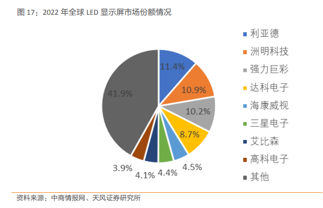 目前洲明拥有全球最大的LED智能工厂,在智慧制造、无人制造和高精细制造领域具有领先优势。软件和生态方面,洲明目前能够提供除传统音视频数字内容以外的裸眼3D、XR虚拟拍摄、AI数字虚拟人等多种创新类型数字内容。通过在前期的人物设计、人机交互、动态捕捉及相关的软件开发等方面持续发力,应用场景涵盖了影视制作、建筑设计、教育培训、营销广告、医疗保健等相关领域。2022年,在全球LED显示屏市场中,洲明科技的市场份额位居第二。