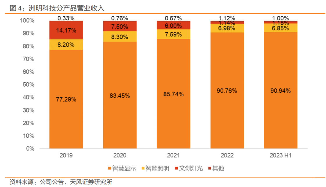 公司主营业务分为智慧显示、智能照明、文创灯光及其他。