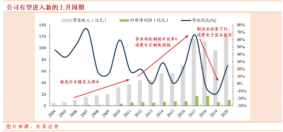 激光行业虽作为黄金成长性赛道,但激光设备属于制造业大范畴,受下游投资周期带来的需求波动影响,复盘公司发展历程,大致经历以下几个阶段:
