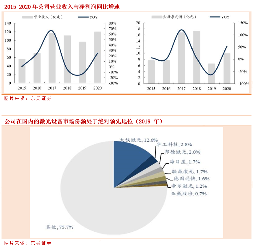 总体来看,我们认为,在制造业持续复苏背景下,叠加激光加工渗透率,激光设备行业景气度不断提升,行业拐点已经出现。同时,公司在国内的激光设备市场份额处于绝对领先地位,在激光行业景度提升背景下,公司将进入新一轮的上升周期。