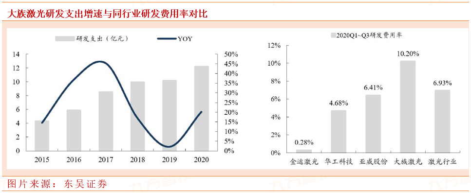 研发投入持续快速增长,研发费用率领先于同行竞争对手。公司以自主创新为企业发展的立足之本,近年来持续在各细分领域加大研发投入力度,2015-2020年研发支出年复合增速达到23.28%,2020 年公司研发费用达到12.18 亿元,对应研发费用率为10.20%,以2020Q1~Q3 数据为对比,公司的研发费用率(8.50%)明显高于亚威股份(6.41%)和华工科技(4.68%)等本土第一梯队激光设备厂商,高研发投入有助于从底层巩固公司在行业内的竞争力。